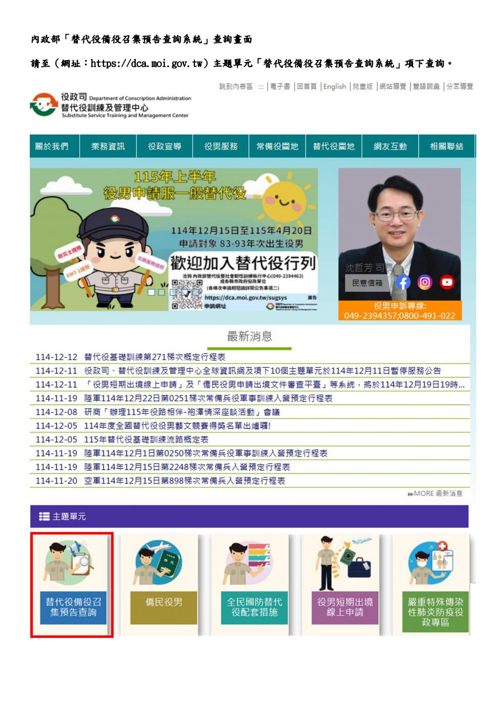 為提升替代役備役召集作業透明度與可預期性,並利於役男及各執行單位預為規劃安排,內政部業已建置「替代役備役召集預告查詢系統」,訂於115年1月1日上午10時起正式上線運作。