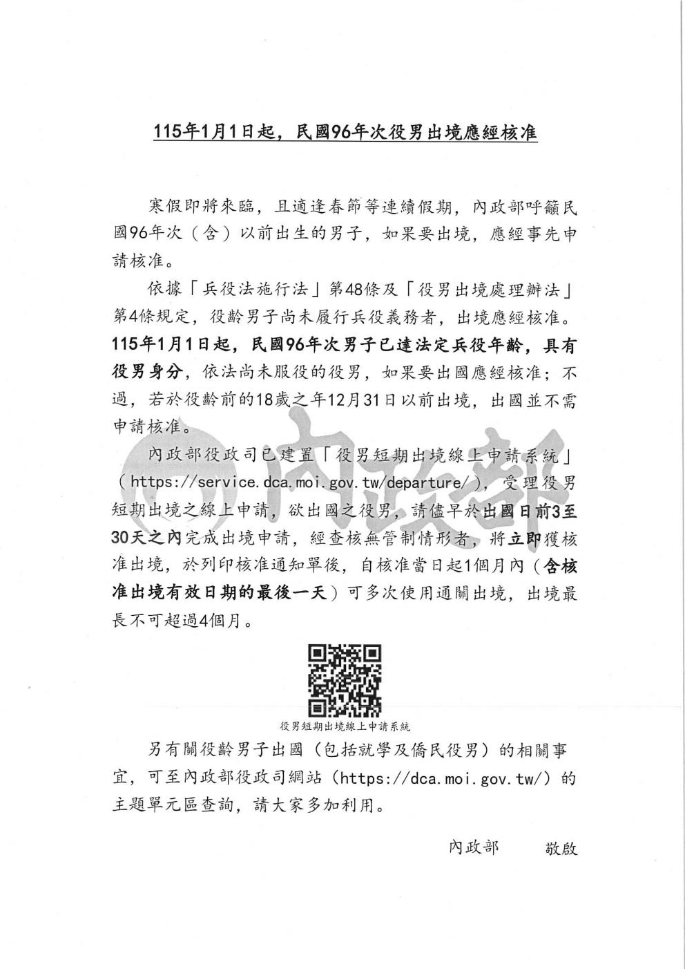 依「兵役法施行法」第48條及「役男出境處理辦法」第4條規定,役齡男子尚未履行兵役義務者,出境應經核准。自115年1月1日起,96年次出生男子已達法定兵役年齡,具役男身分,如尚未履行兵役義務者,出國應經核准。
